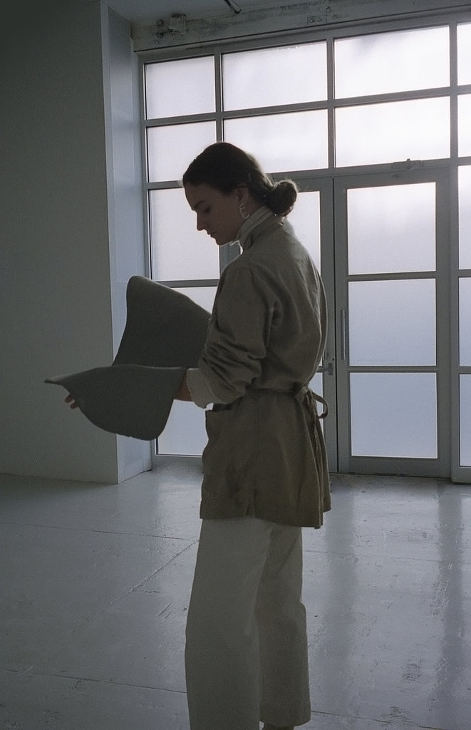 I believe in a uniform - how I present myself to the world feels like an extension of my work in a way. I had been moving towards all neutral tones for a while and committed fully when I went to Georgia O’Keefe’s show at the Brooklyn Museum last spring. The work she made, the spaces she lived in and worked in, and the clothes she put on her back - often pieces she made for herself - all reflected a modern aesthetic which was very radical and powerful for a woman to cultivate all on her own. I came home from the show, emptied my closet of all the color I never wore but felt guilty about owning, and donated it. I’m starting to mix in some earth tones and patterns now though. Everyone is very confused but I’m having fun. For practicality sake, white also works really well with this medium. The clay I use is a light body and the glazes I use are also in the neutral spectrum so when I unavoidably get it all over me when I’m working, it’s hard to tell.