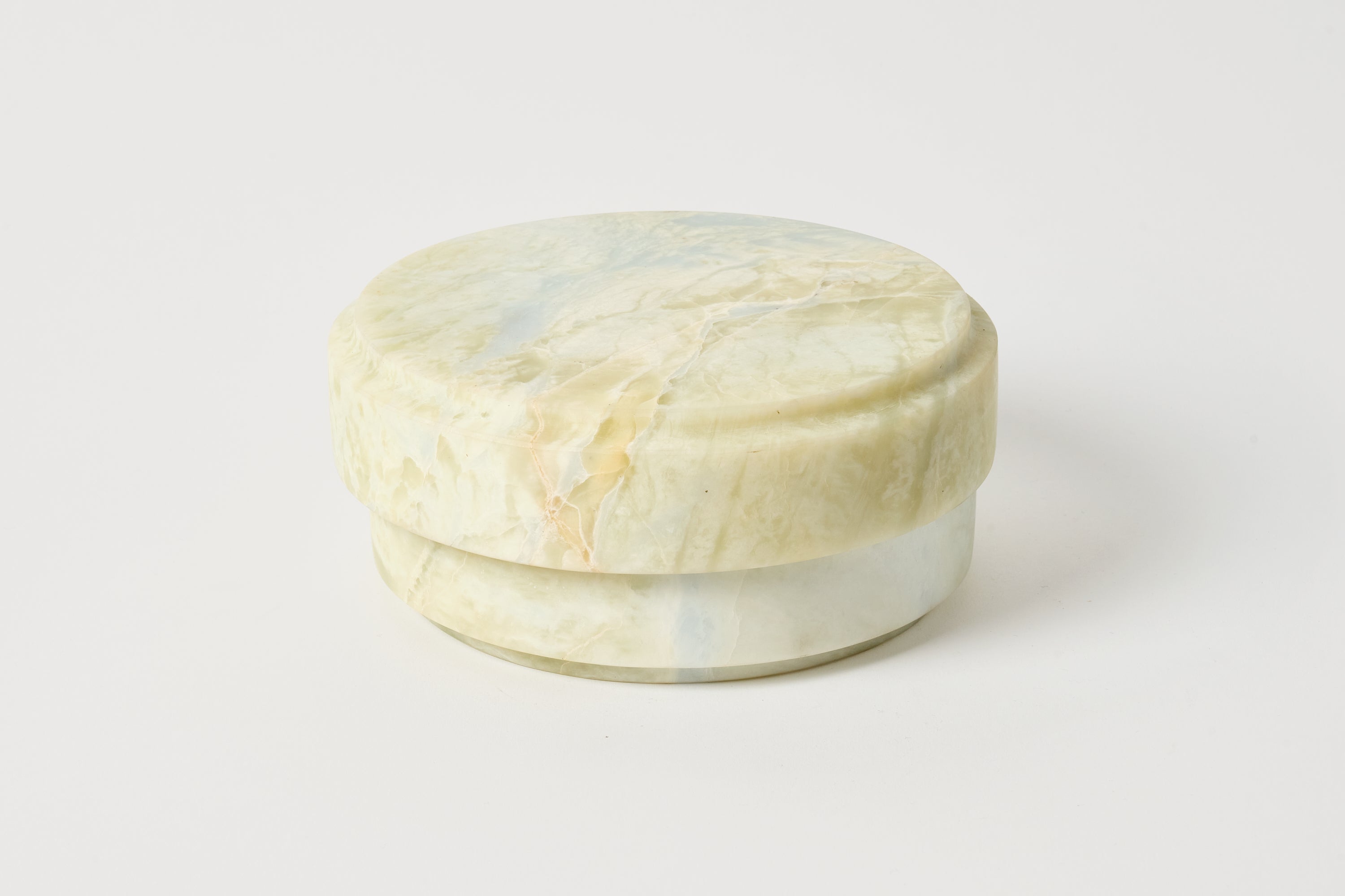 Resting upon a recessed carved base a shallow pocket is topped with a oversized lid. Originating from a column of stone, halves are separated and detailed to fit within one another. Finally an interior cavity if carved from the two halves to conceal a void.
