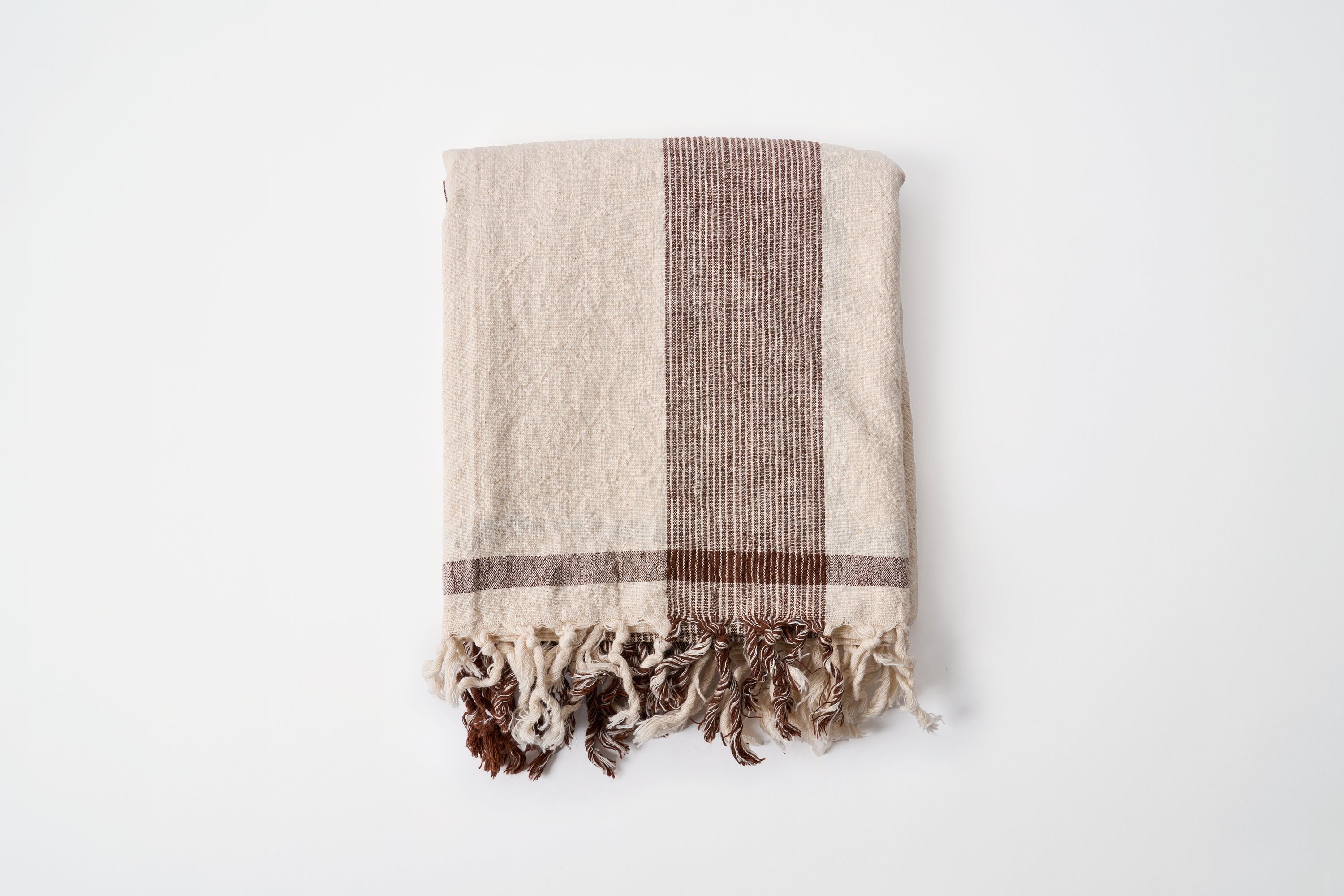 Pure unbleached cotton with natural brown borders. A nice generous size for bath or beach. Made in India. No two are exactly alike. 100% cotton khadi.