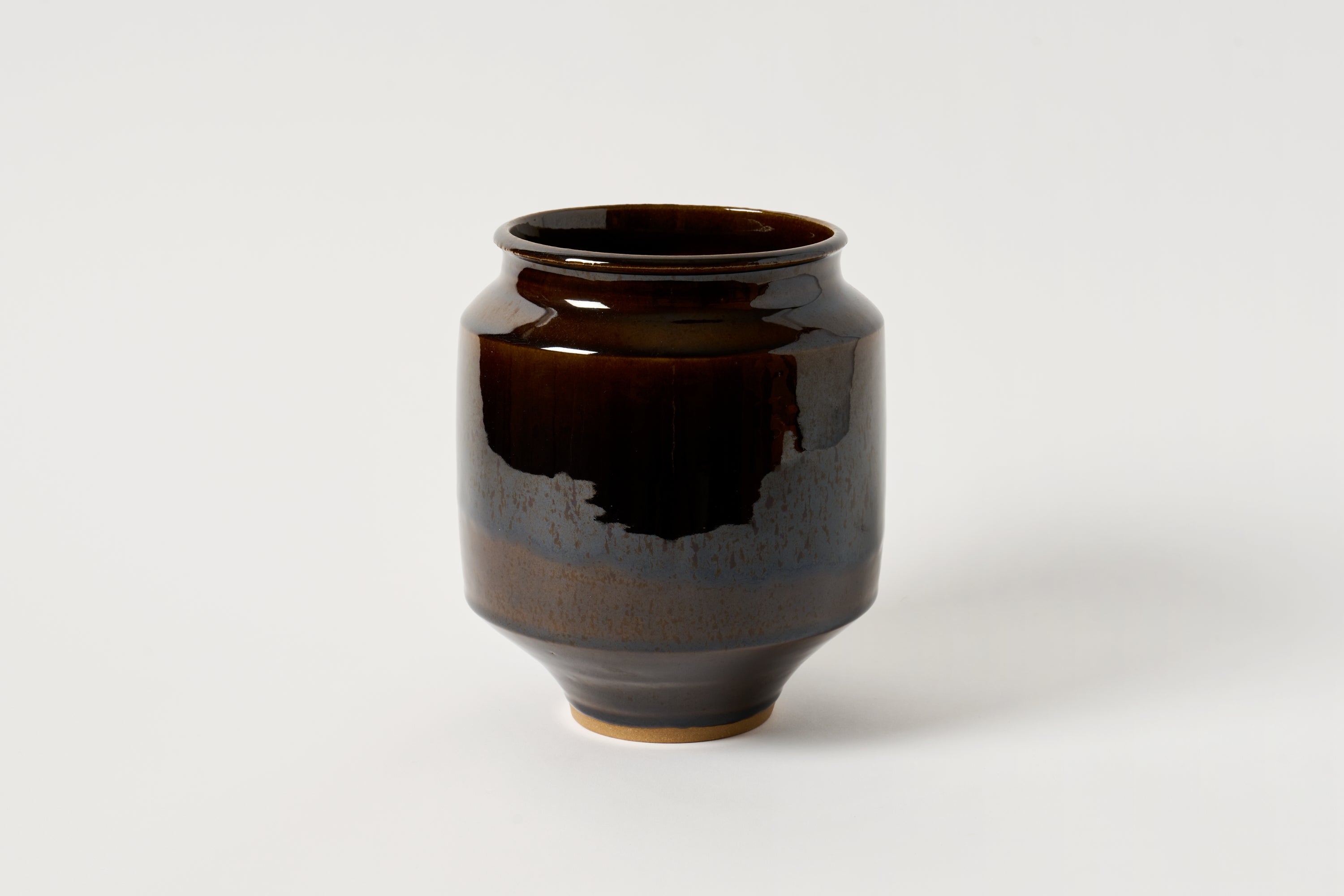 Handmade in California, this piece is a modern take on a classic, minimalist vessel. Offered in a rich, glossy brown glaze.