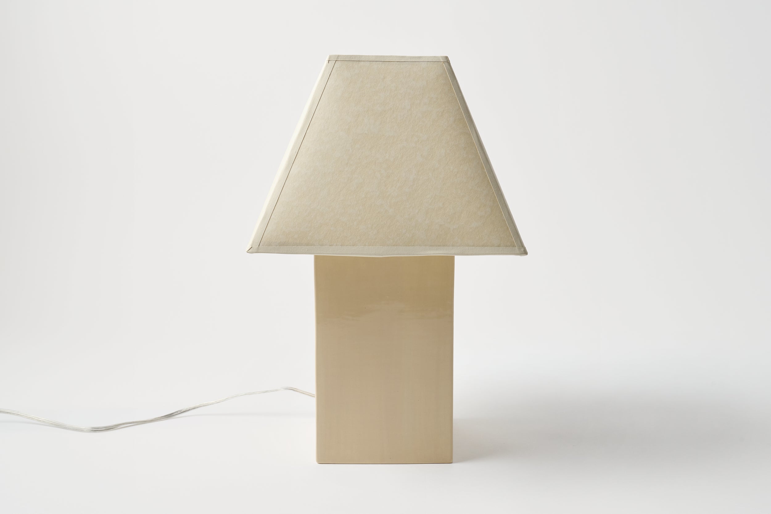 Hand-built and painted ceramic lamp; stamped. Custom square lampshade in natural paper parchment; brass clip-on.