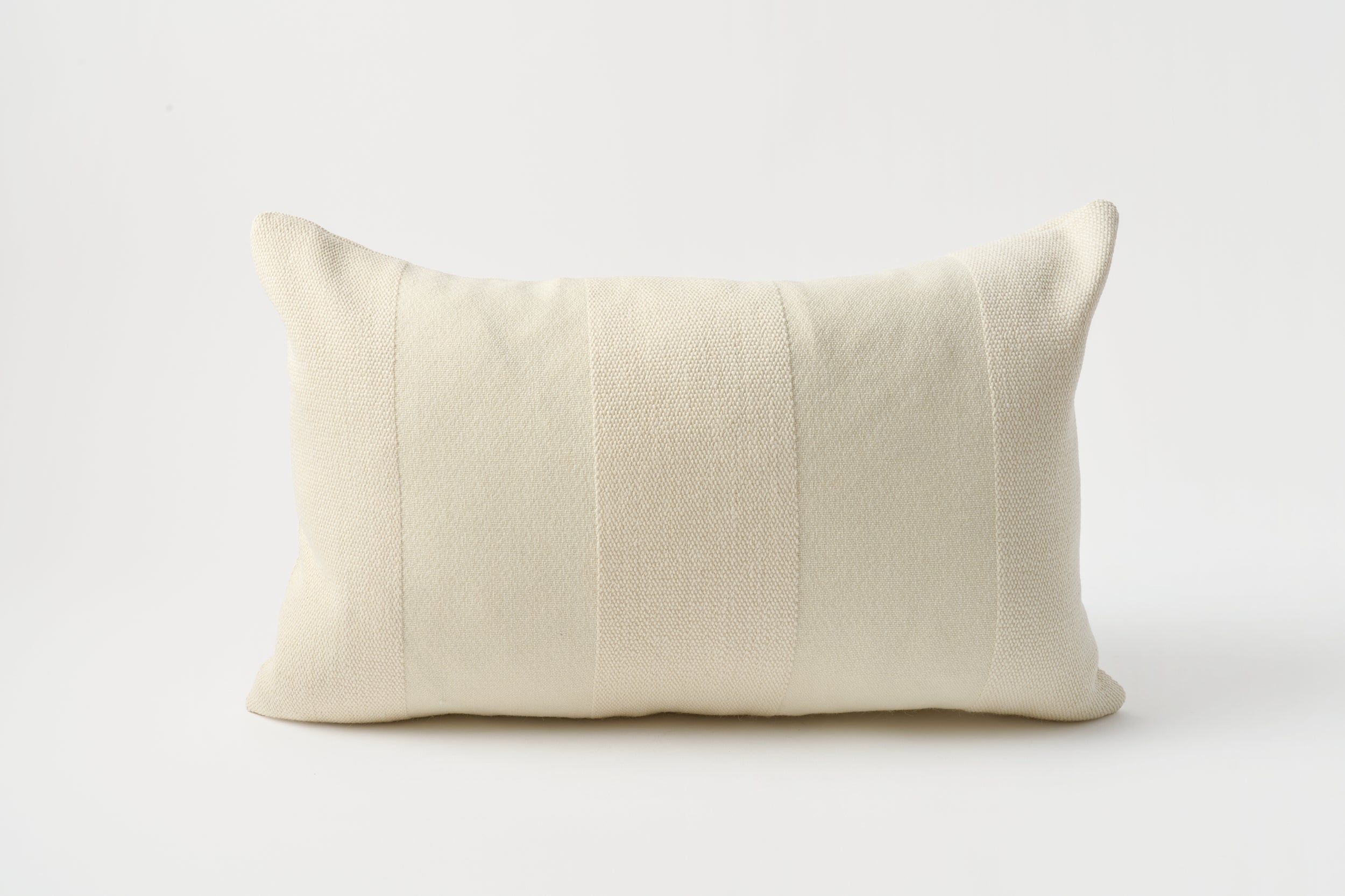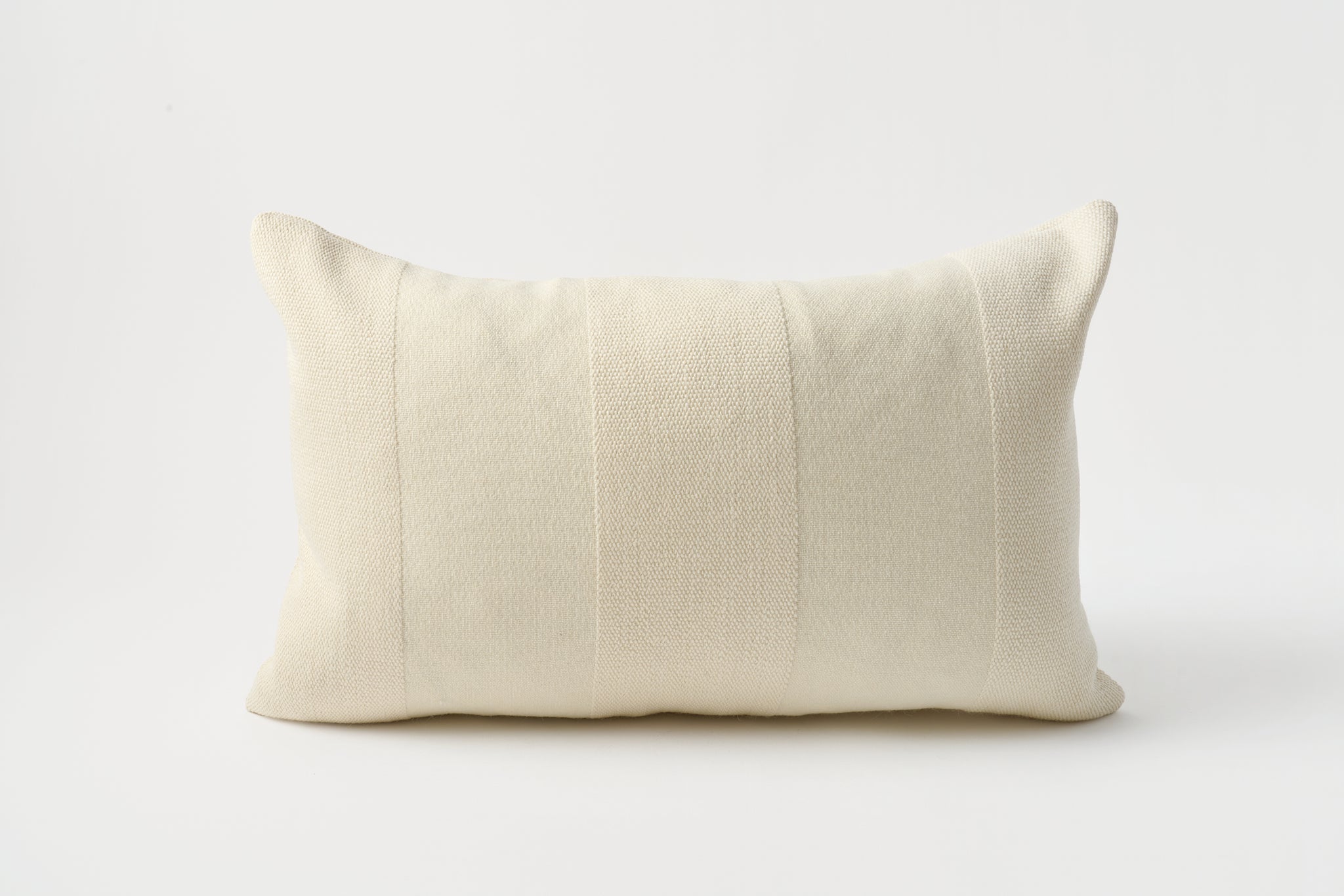 The confident stripes of Reflex rise above the fabric’s flat-woven base, resembling 10cm-wide strips of embroidery executed in a slightly irregular yarn. This rich, soft woollen yarn leaves patches of the base colour visible through the weave, resulting in a sense of depth and complexity in its colour. The wide, clean-edged stripe is both boldly graphic and arrestingly tactile.