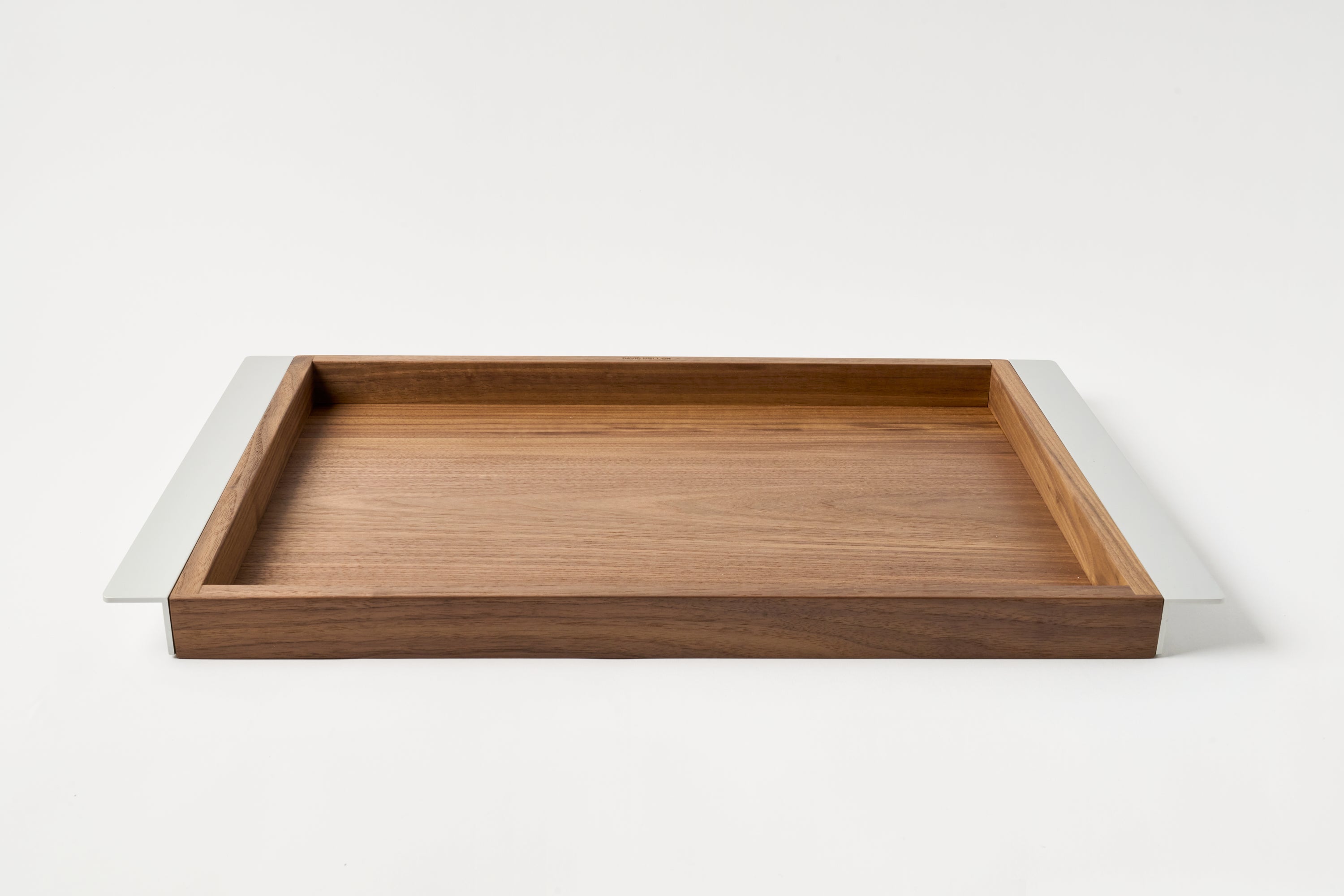 Beautiful tray made in top-grade walnut with an oiled finish. The anodized aluminium handle not only gives this tray its special visual character, it is also very practical to hold. Corin Mellor’s versatile tray is the perfect size for use as a drinks tray or a breakfast/supper tray.